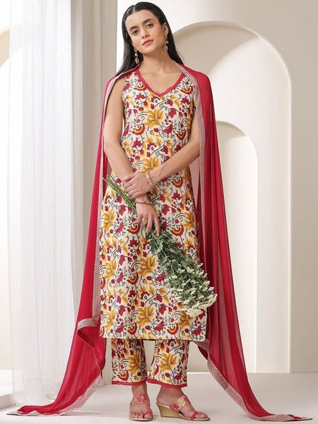 Floral Printed V-Neck Pure Cotton Straight Kurta With Trousers & Dupatta Set